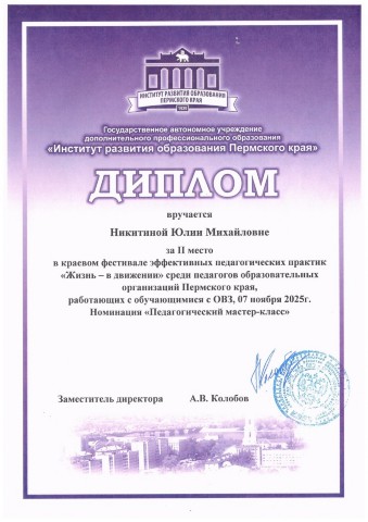 Никитина Ю.М.-краевой фестиваль эффективных педагогических практик "Жихнь-в движении" среди педагогов образовательных организаций Пермского края.
