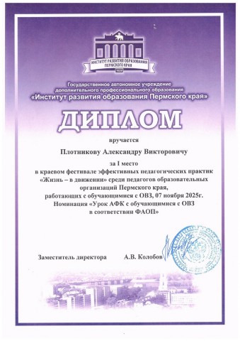 Плотников А.В. - Диплом победителю краевого фестиваля эффективных педагогических практик "Жизнь - в движении" среди педагогов образовательных организаций Пермского края, работающих с обучающимися с ограниченными возможностями здоровья 24.11.2023г. ГАУ ДПО "Институт развития образования Пермского края", Пермь, 2023г. |